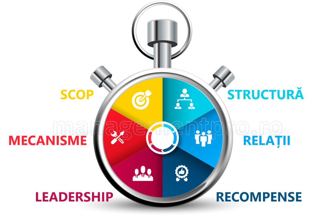 - Scop – scopul organizației trebuie să fie clar pentru toți angajații, iar aceștia trebuie să îl accepte, chiar dacă viziunea lor personală este diferă.